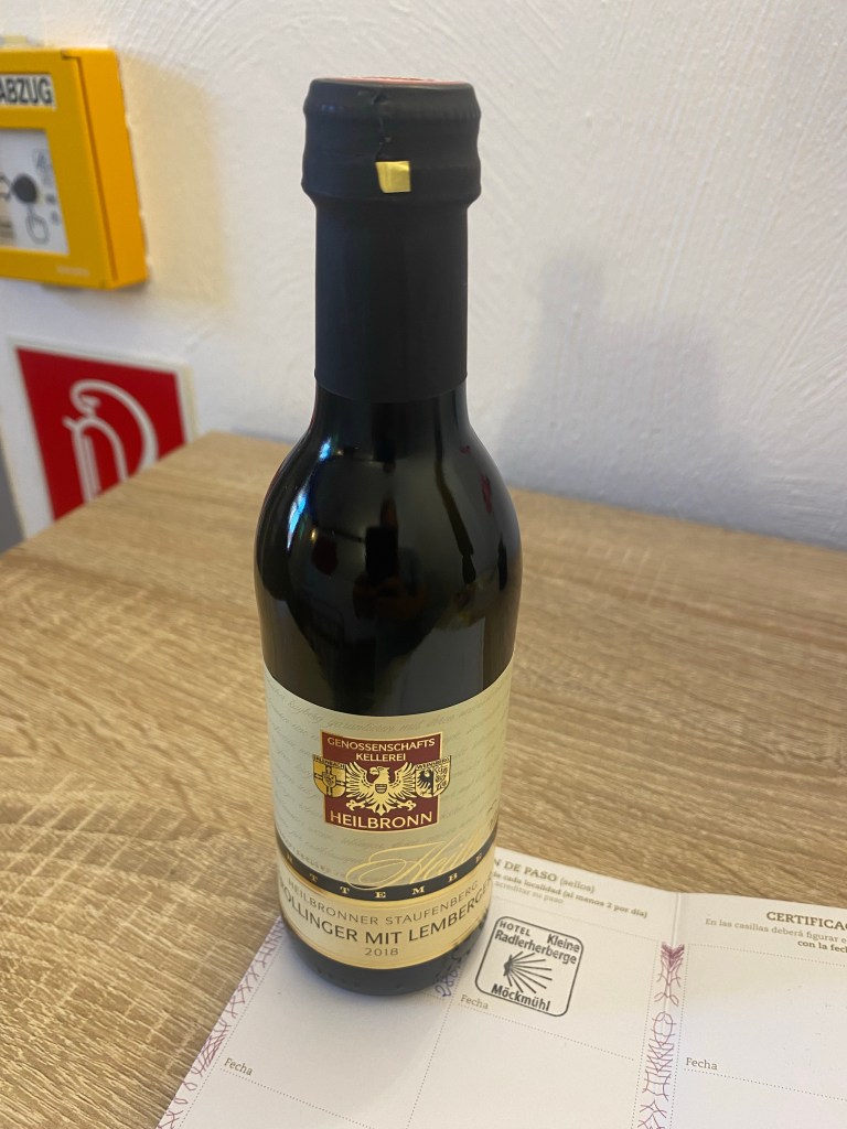 Als mich wenig später die Dame für die Herberge Wegenetz Rechnung per WhatsApp kontaktiert (die Herberge funktioniert ohne Personal), frage ich nach, ob sie noch eine Möglichkeit weiß einen Stempel zu bekommen. Eine halbe Stunde später kommt der Chef vorbei mit Stempel und einer kleinen Flasche Rotwein als Geschenk… manchmal muss man nur lieb fragen. Prost!
